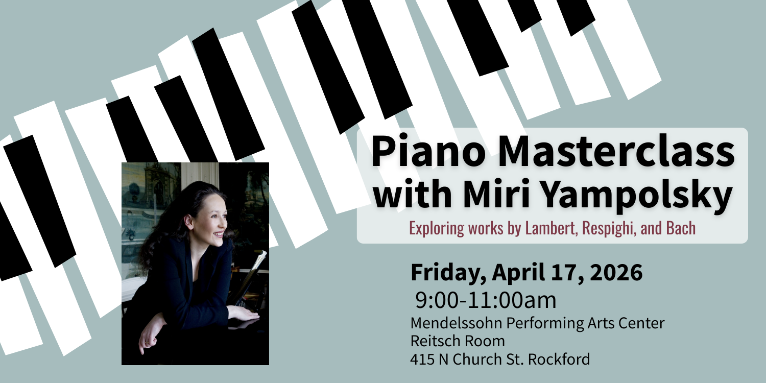 Back to All Events Piano Masterclass with Miri Yampolsky Friday, April 17, 2026 9:00 AM 11:00 AM Mendelssohn Performing Arts Center 415 North Church Street Rockford, IL, 61103 United States (map) Google Calendar ICS MASTERCLASS IS FREE AND OPEN TO THE PUBLIC! Presented by the RSO and the MPAC Adult Piano Group. Miri Yampolsky will perform Beethoven’s Piano Concerto No. 4 with the RSO at the Coronado Theatre on Sat. April 18 at 7:30pm.Adult tickets begin at $35, and kids are free!